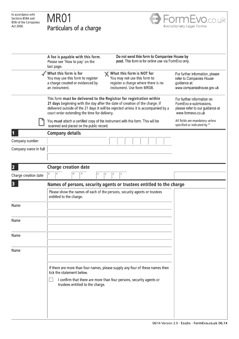 Companies house forms for limited. To register a charge that is created or evidenced by an instrument on or after 6th april 2013 form mr01 form llmr01 for llps must be completed and delivered to companies house online or by post within 21 days beginning with the day after the charge is created. A charge created on 01022020 must be delivered by 22022020.
