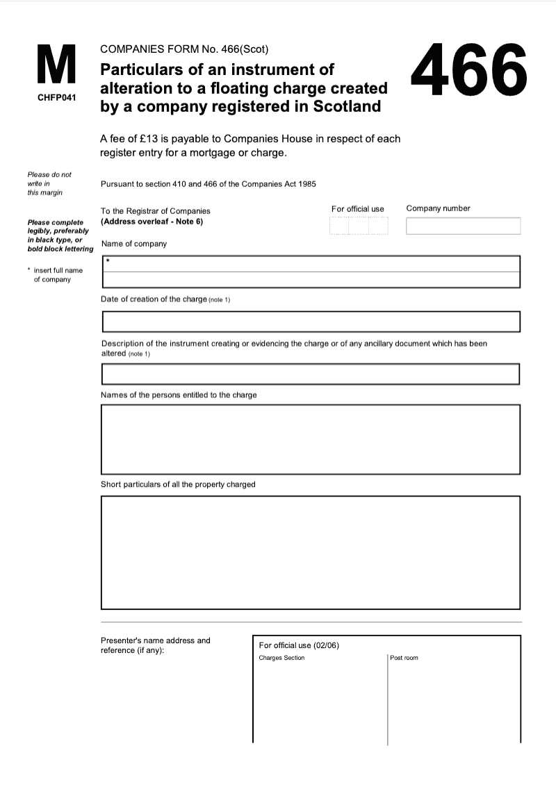 A fee is payable with the application which is usually made on form mr01 together with a certified copy of the security document. These registration fees do not apply to documents delivered under the companies act 1985 or the companies northern ireland order 1986. Any document delivered under these acts will be free of charge.